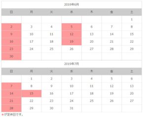 2019年6月,7月の休業日について
